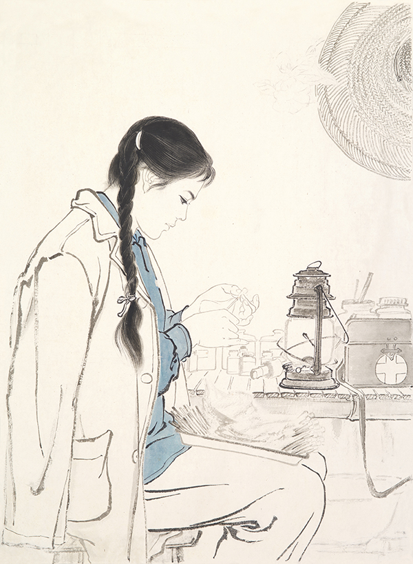为了完成这张画作,王玉珏画了许多草图。在广东美术馆馆藏的这张白描稿上,已经能看到最终稿中的所有细节:在人物方面,作者用精细的工笔画法描绘了人物的脸部和手部,将观者的眼光吸引到小小的棉签之上。随意披在身上的医务外套表明了人物的身份,挂在墙上的草帽暗示了她“风里来雨里去”的工作状态。在背景中,药箱、药瓶,进一步确证了医生的身份。