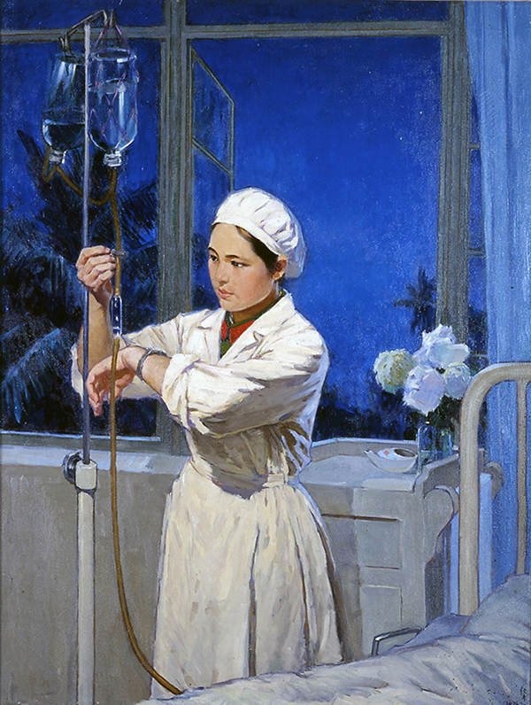 油画《点点滴滴在心头》创作于1974年。作者李仁杰描绘了在夜深人静时,一位女护士在对着手表调整病人输液速度的瞬间。白大褂下露出的军装,表明了这位护士的军人身份。大面积的冷调蓝色背景和白色衣服,衬托出护士冷静、从容的面容。画中只有领口的一抹鲜红和人物肌肤的一点暖色,却犹如寒夜中的星火一般,让观者瞬间有了淡定、温暖的心境。