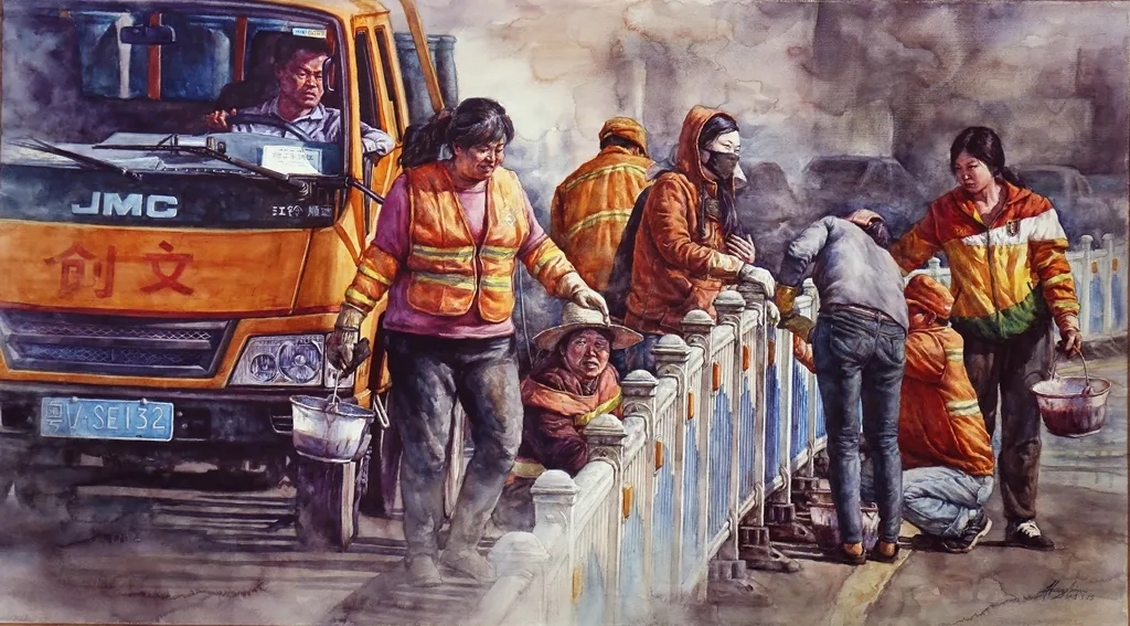 据作者介绍:作品在构图上,根据道路清洁任务的特性以横向构图展现。道路中间的弧形栏杆是整幅创作的“导火线”,因此我将栏杆穿插在工人当中,工人分成左右两个小组,以体现其工作分配上的合理性。在人物位置和动态的安排上,我组合了前、后、左、右、站、蹲等多种人物动态,更好体现场面的自然性和节奏性。朦胧的都市景象和来往的车流表述出城市清洁工作的艰辛与危险,可环卫工人们依旧默默无闻的为这座城市付出。作品旨在呼吁广大市民对环卫工人的关怀,讲究卫生,减轻城市清洁工作负担,将美化环境作为己任,一起为创建文明城市而努力。