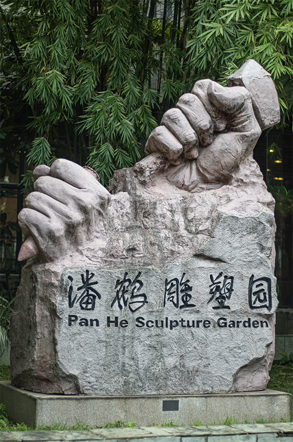 “雕塑家之手”是潘鹤雕塑园的标志。潘鹤在该雕塑背面刻诗一首:“天意欣逢生乱世,书生无力扭乾坤。借得南天半壁石,凝固此生未了情。”