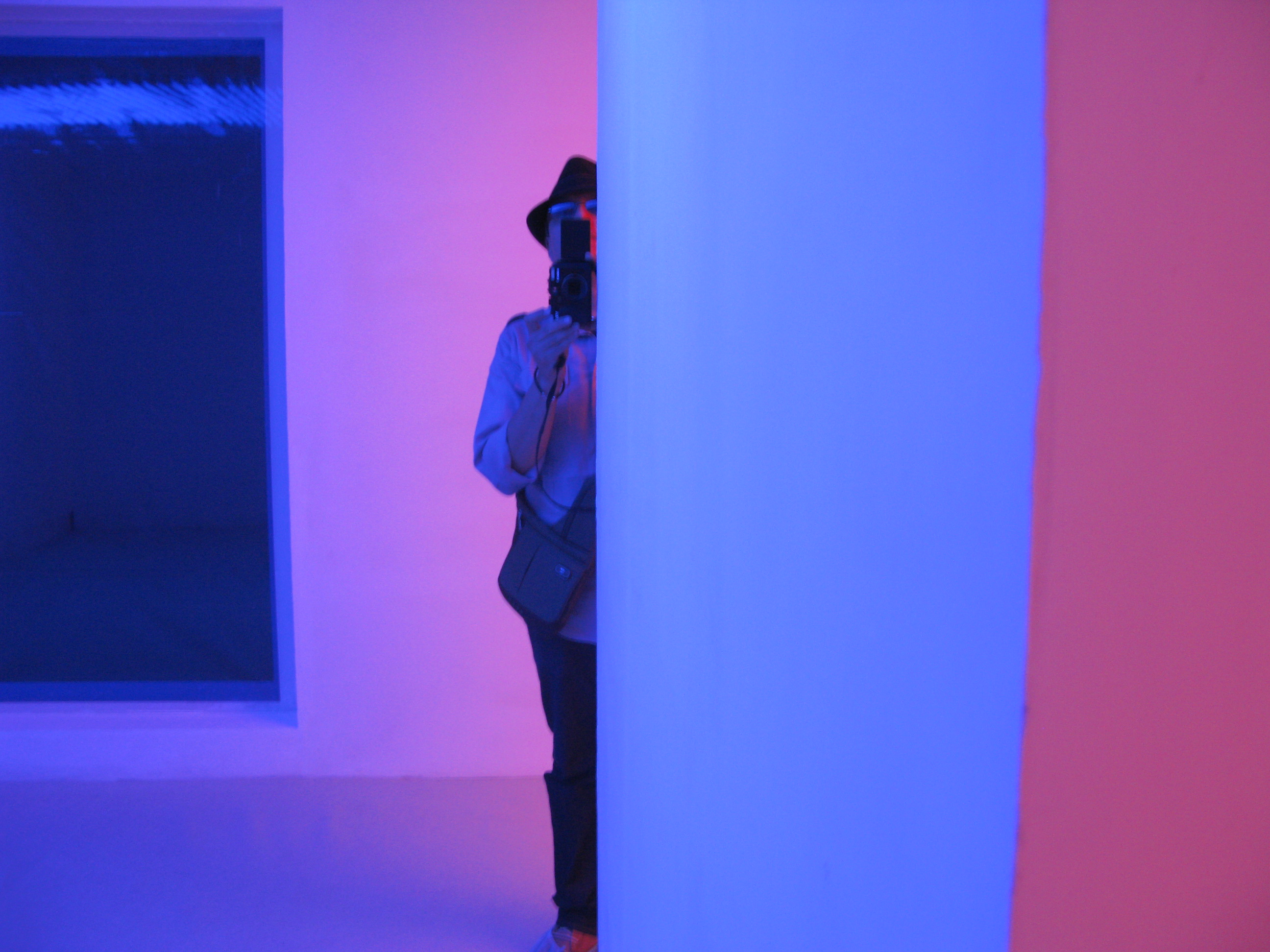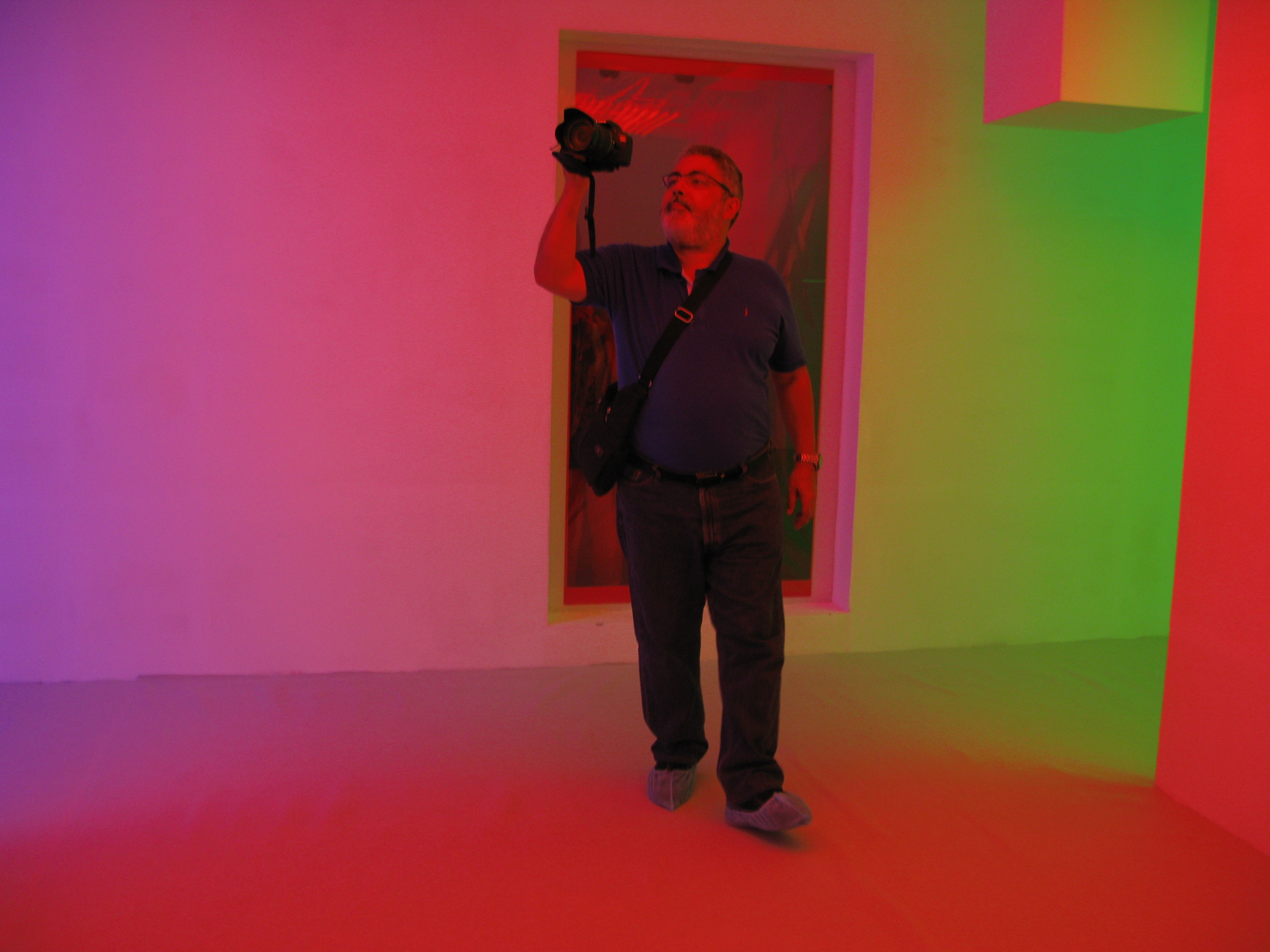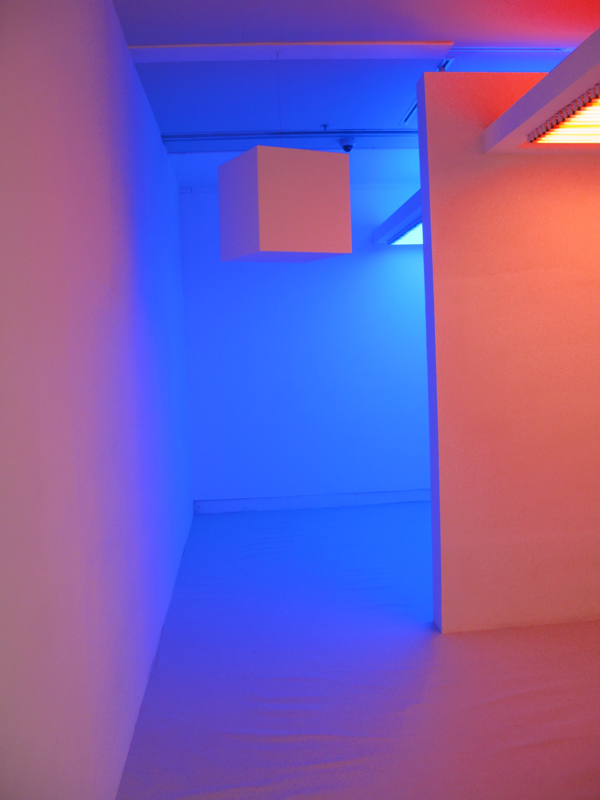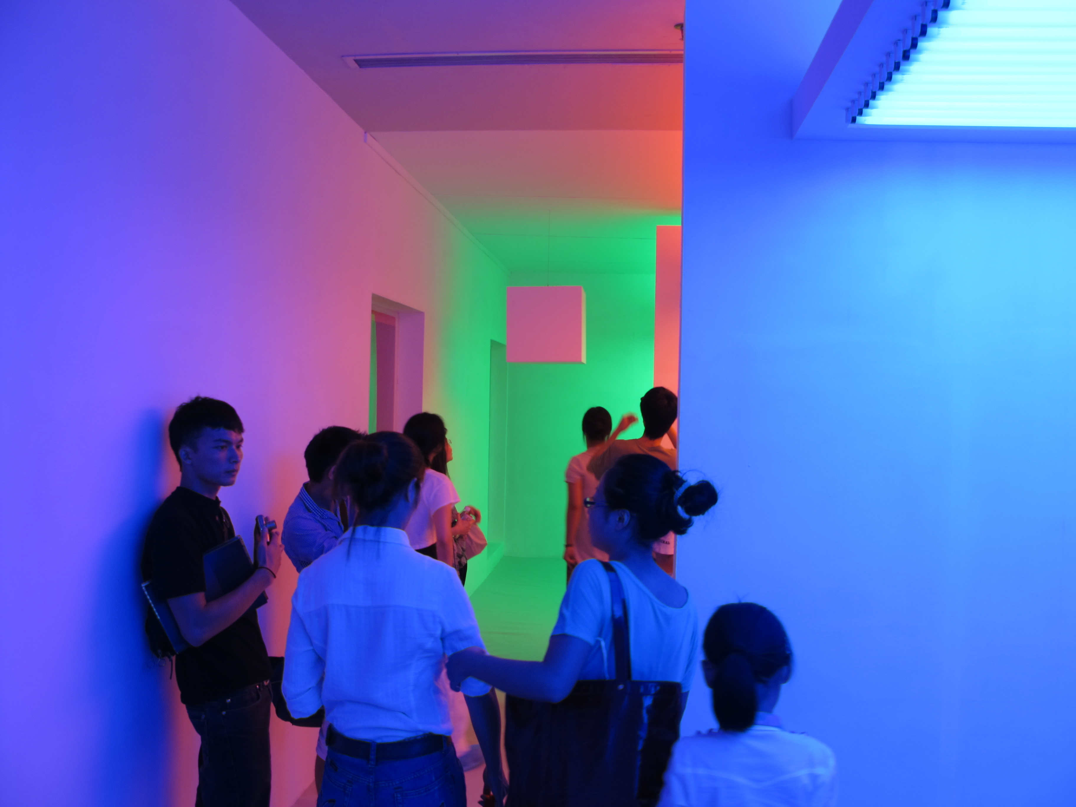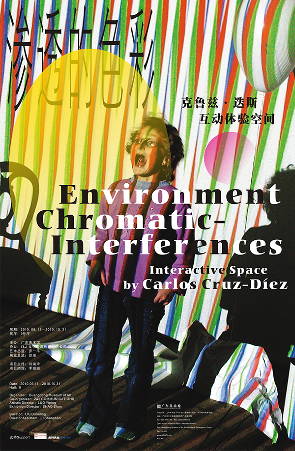 “色彩介入下的环境”是一件表现色彩抽象化和模糊化运动的作品。由一些静态和动态的线性色光组成,形成一种静止和运动模棱两可的情境。当这些彩色线条投射到人和物体上时,这些色线就会改变被投射物的视觉形态。如果观众把目光集中在墙上的影子,就会产生移动方向与色线方向相反的错视感。观众在此空间中的活动将成为此作品得以完整的不可或缺的因素。