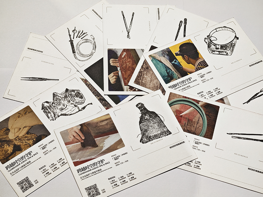 结合“跨越时空的守护——艺术品保护与修复专题展”。我们在二沙岛馆区推出微寻宝游戏:寻找修复的痕迹。活动期间,观众可免费抽取9款随机获取的微寻宝阅读卡,根据卡片的线索,走进展厅仔细观看展览,寻找和发现展览的细节和信息,在教育互动区答题,答对并投稿即可获得修复工具元素纪念印章。观众还可以扫码阅读,进一步了解艺术品的保护与修复。