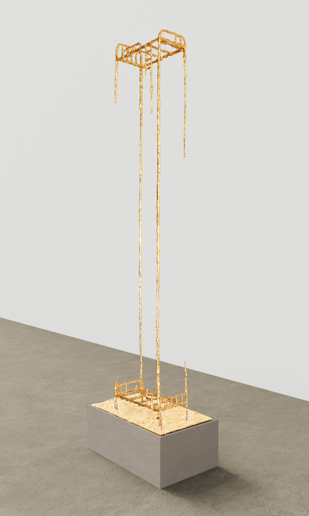 我们终生和床发生关系,生在上面,长在上面,终于之上,床就是人生的物象!上下床的距离拉伸表象看是床的物理空间发生变化,实则是指向了人与人的关系。东方最早展现出床的“炫耀”与“奢侈”属性,残床骨架利用反向逻辑推演,通过金箔的加持来削弱床的残,外在的掩饰下带有仪式感与讽刺感。