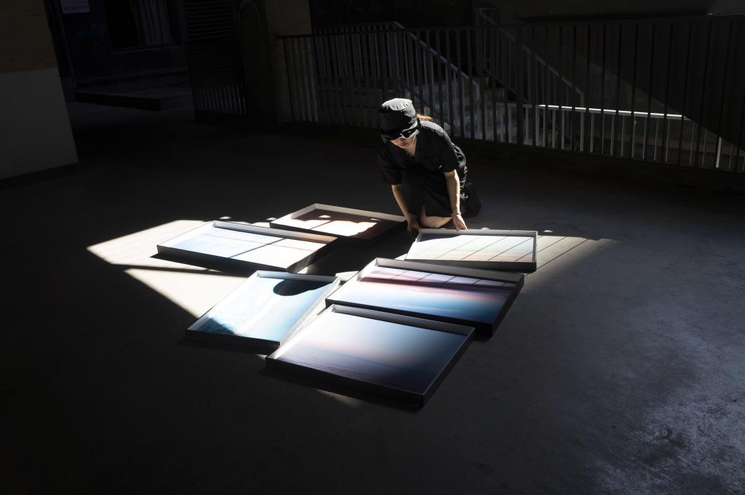 日出的海平面,打印出来后,每逢晴天用阳光晒它,把海面晒旧,晒成日落的样子。最终日出、日中和日落三个有关“日光”的时间都共存在了一张照片中。