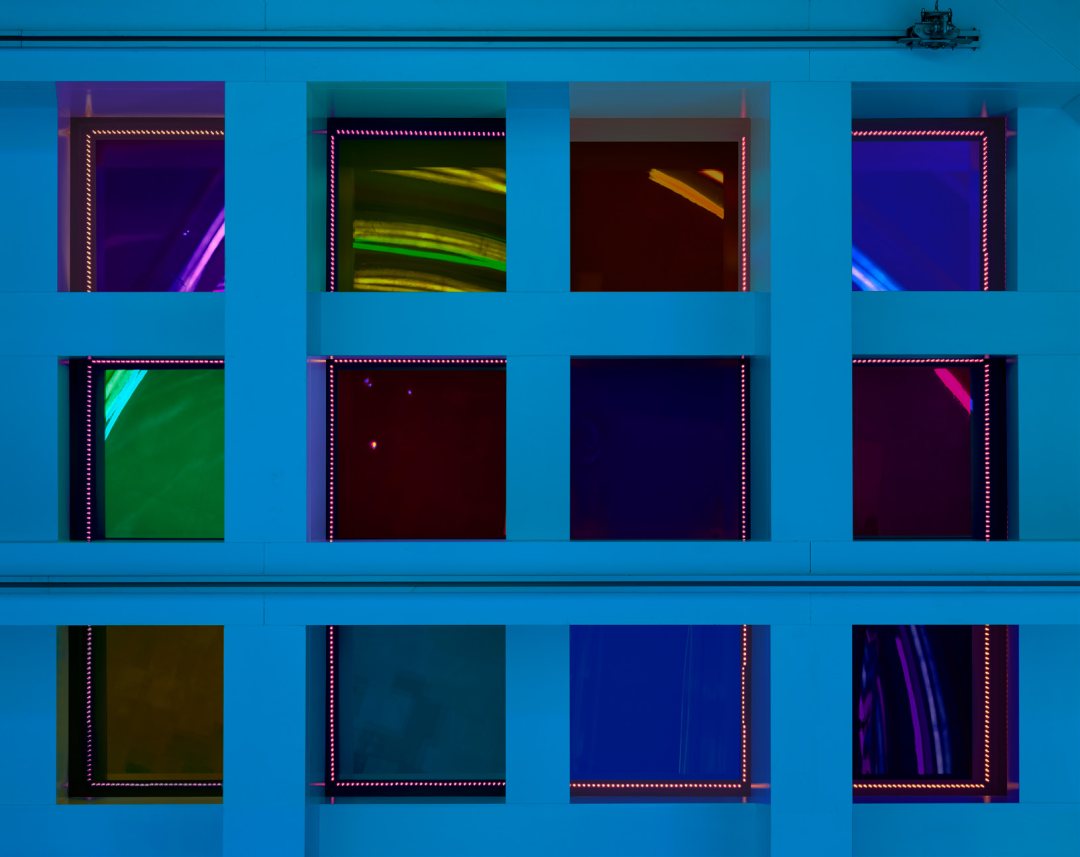 《寻像器/商场》系列摄影,以商场中各种各样的玻璃窗为拍摄主体,经过感性的冥想和数字算法生成新的图景,从而引发新的视觉认知可能。艺术家致力于光与色彩的研究,通过影像、摄影和装置,从我们日常中熟悉的记忆出发,使用在地性元素进行创作,在“窗户”的分割和融合中产生空间和场景变化,唤起人们内心的情感。