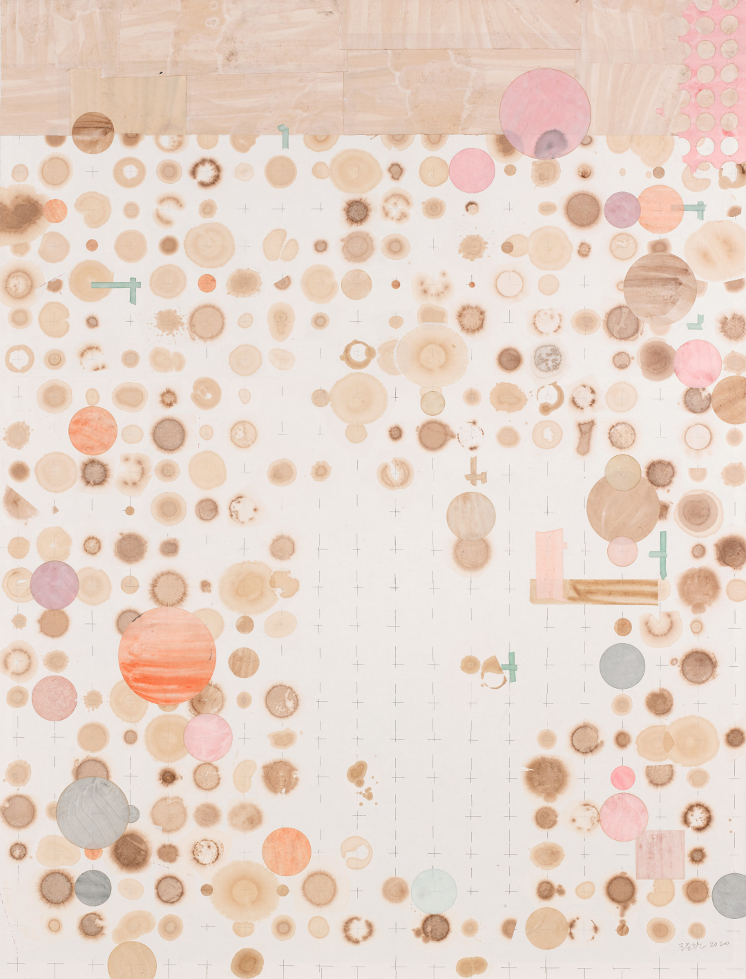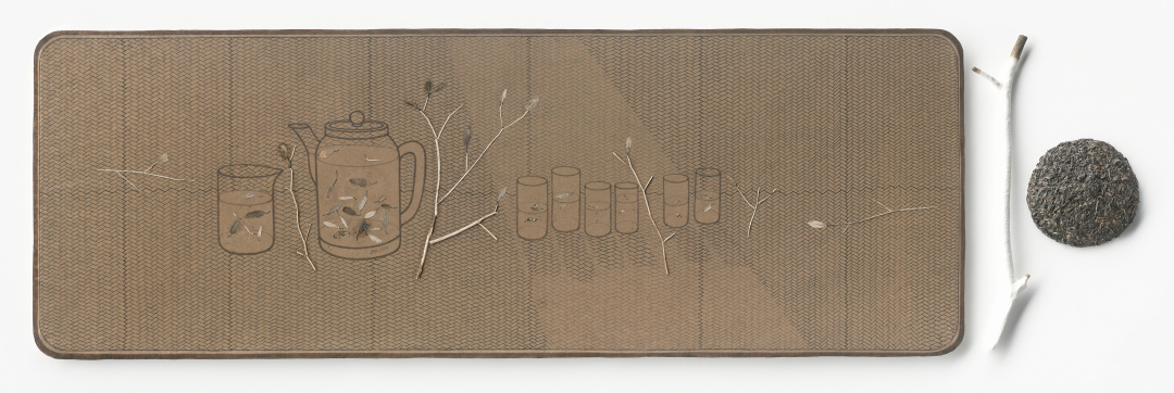 以茶水为墨,慢慢将宣纸渗透,空白的宣纸上便晕染出深浅不一的茶迹。再将宣纸进行重复性地拼贴,画面上形成丰富又充满节奏的视觉美感。以茶入画,将平淡日常介入抽象创作,在潺潺禅意之间,留下时间的痕迹。