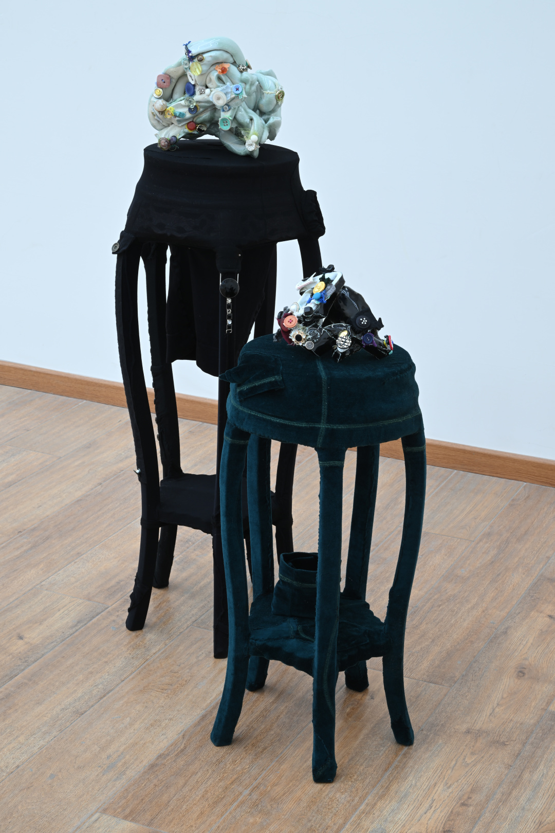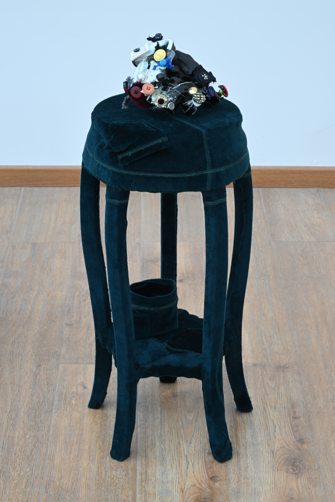 《花架》系列是将使用过的古典花架和穿过的衣服缝制而成的物,它有着“气口儿”在呼吸,也有着包裹身体的温度。衣服的遮挡犹如人体穿衣时的似遮似露,也给予它生命感。