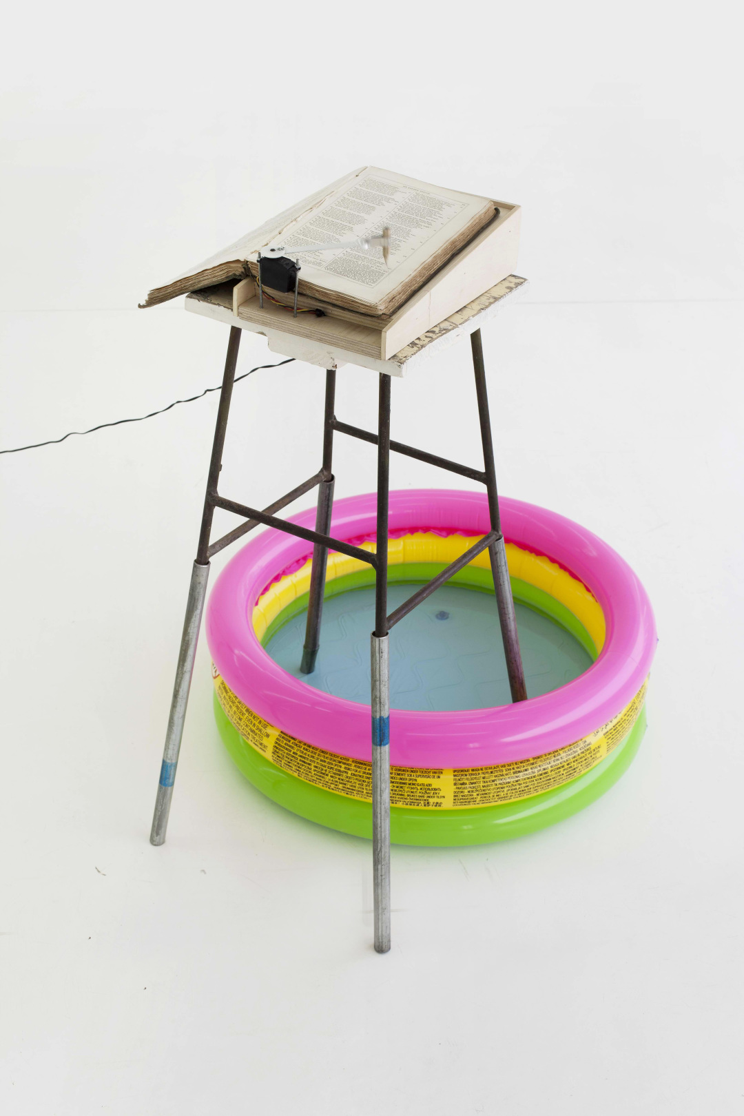 遥控器控制的马达带动铅笔打开书并在书页上做不规则的划动,诗歌慢慢破损。