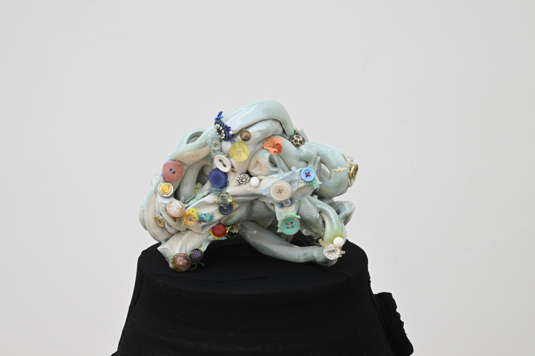 《扣儿》是一个系列作品,这些陶瓷雕塑起初是由制作瓷板时裁下的边条儿相互缠绕所结成的“谜团”。这些边条儿是真正的边缘,不被主体接纳,它被去除,直至扔掉,消失。我把它们相互缠绕成团,再以“扣儿”为媒介在缠绕的团上设置“无解之解”的寄生物,如同一个谜团。后来我直接将瓷板的主体肢解成条,使主体不在,只剩下肢解后留下的很多“边条儿”。这些成为新的《扣儿》的物料。这些条状物互相缠绕,堆叠,形成缝隙和孔洞,如同假山石般的谜团,瘦漏透。由窑火炼就成瓷,坚硬中透着脆弱。