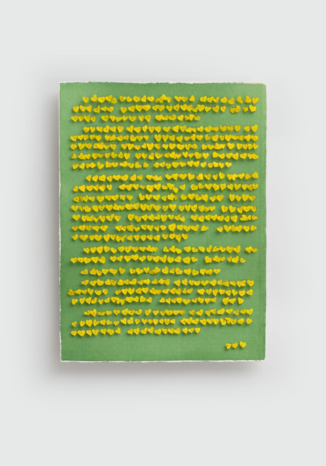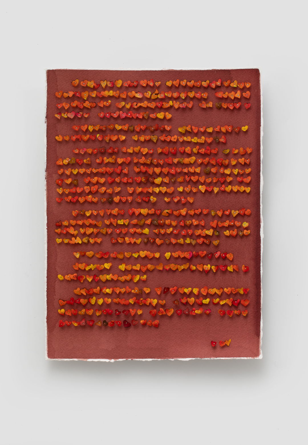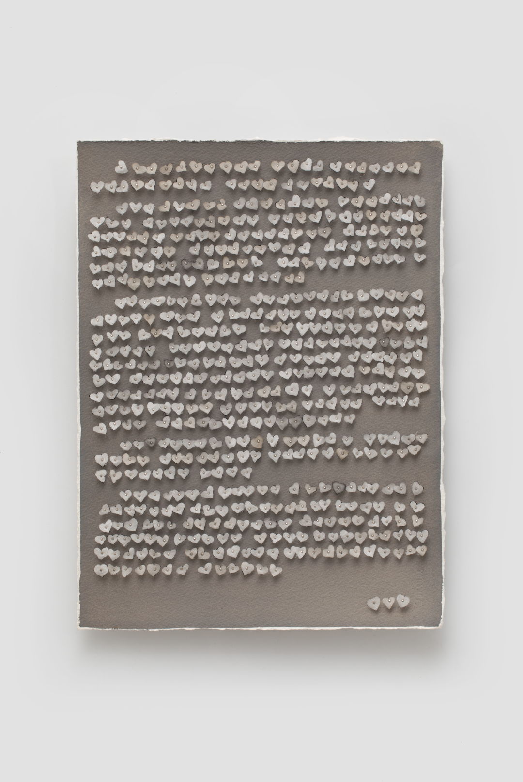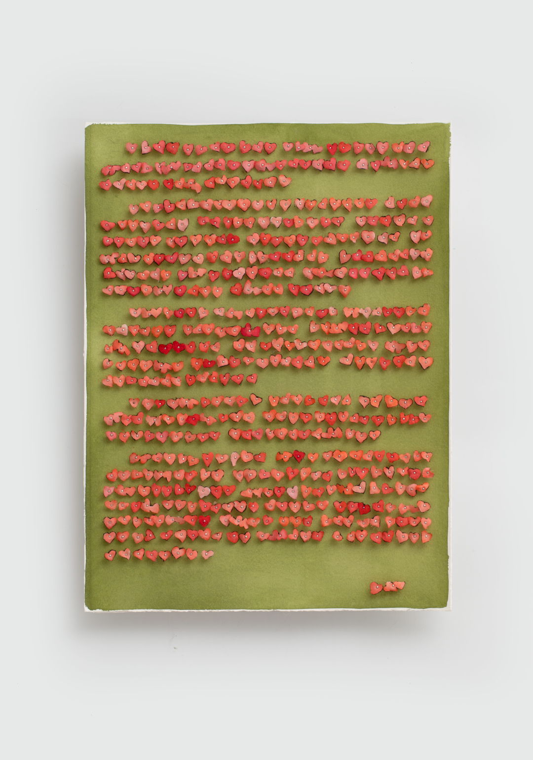 “心”是一种泛指女性心理世界的意象。周围生活中的很多女性,每天在用辛勤劳作的方式,寄托对生活的念想和追求。她们表达爱的方式是如此含蓄、安静而厚重。《某年某月某日·手书》系列中,心形是先用墨水在布上涂写后再剪下来的,然后用大头针穿过布心“扎”写在背景的手工纸上。以单字为最小单元,连成句子及段落,是汉字书写特有的视觉经验。手写墨迹后再剪出的心形,就成为作品自造的一套心形象形字体——虽不可识读,但字字观心。