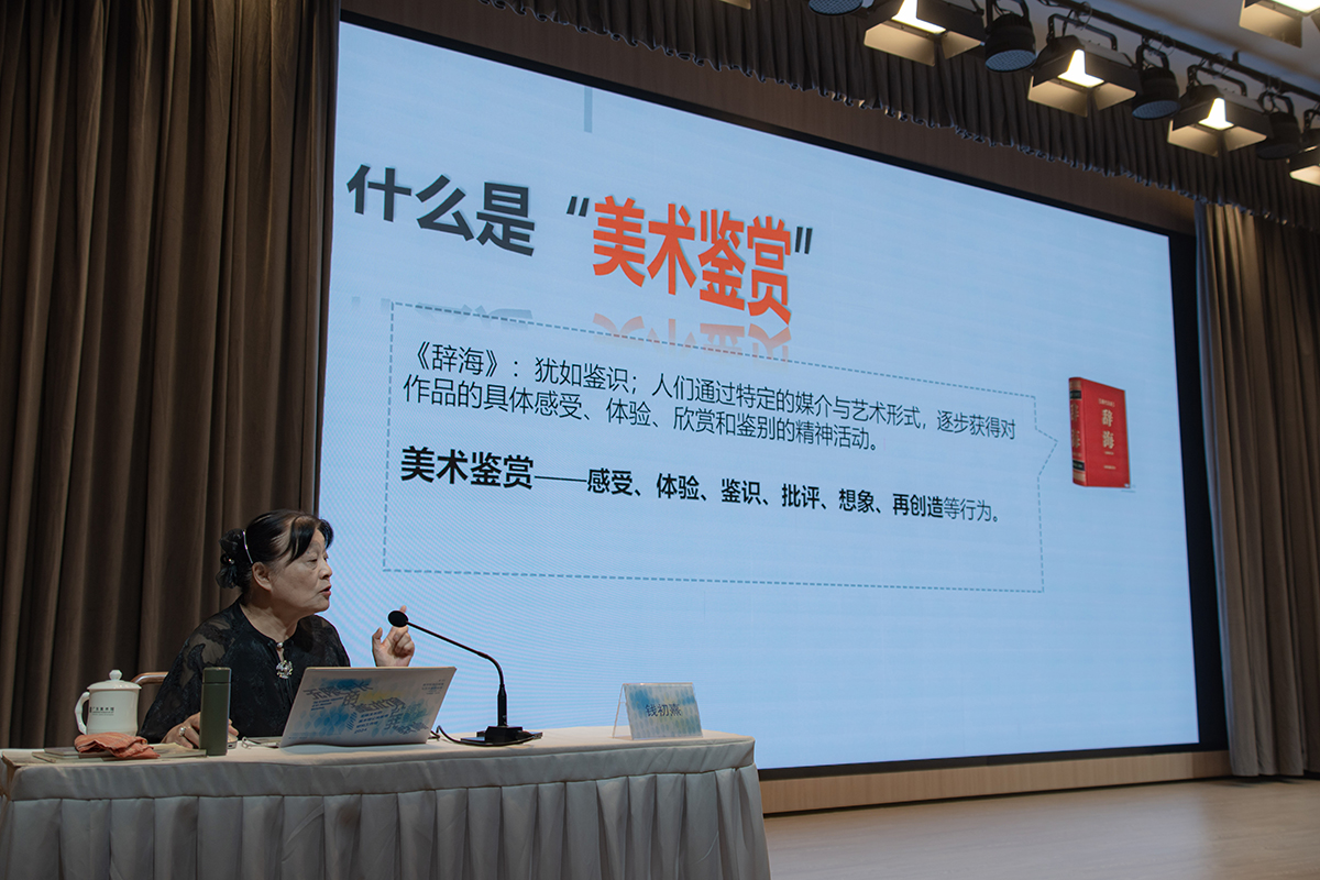钱初熹教授深耕美术教育学、艺术教育哲学、学校美术课程与教学研究、美术教师教育等领域,在主题讲座中,她以其深厚的学术底蕴和丰富的专业经验,讲授了《提升个人艺术素养与促进社会创新的美术鉴赏理念与方略》课题。