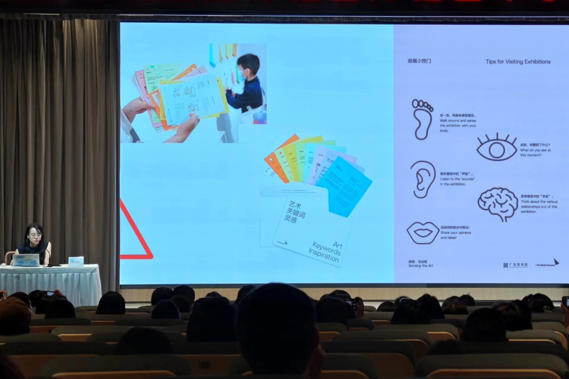 广东美术馆副馆长胡锐韬,广州市教研院美术教研员陈玉萍出席7月28日公开课。参与公开课的320名学员包括了本地中小学教师、美术馆教育人员、艺术教育从业人员、家长、文化志愿者及艺术爱好者,等等。