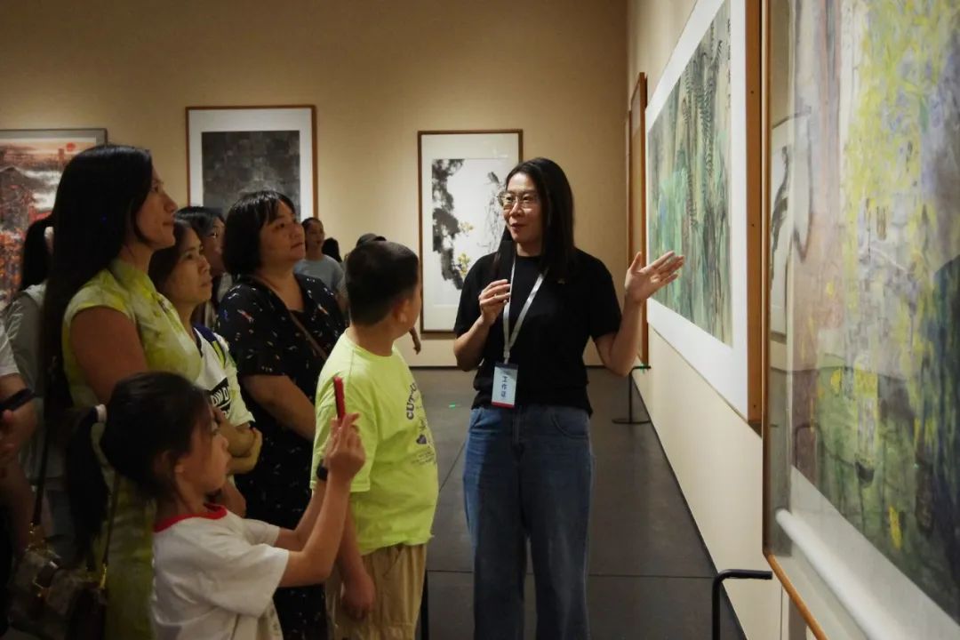 在广东美术馆,学员们在公共教育专员梁语希、郑晓萱、李嘉仪的带领下,在艺术家林蓝的画作中解读岭南风情,识别四种岭南特有的植物——木棉花,芭蕉,鸡蛋花,荔枝;对比观赏苏百钧的《鸟巢系列·松鹤图》与周彦生作品《枫丹白露》,初步认识松鹤题材所特有的寓意;在郭子良《金塘》与郑餐霞作品《饱经风霜》都是荷花题材的作品,大家细数画作中的鸟儿,对比不同的绘画风格;到方向的作品《农家春禧》前时,大家已经学会了在家具、家禽、器物和植物中寻找生活的痕迹,透过场景和风物看见“人”的存在。