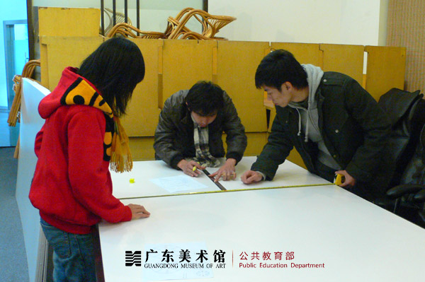 =3= 小树实验成功,三位志愿者(左起:唐栩莹、陈盛文、董俊斌)开始在KT板上绘制大树图样了。三个人画1条线,分毫不能差!有了他们这张精确的样板,接下来的工作就轻松很多了。