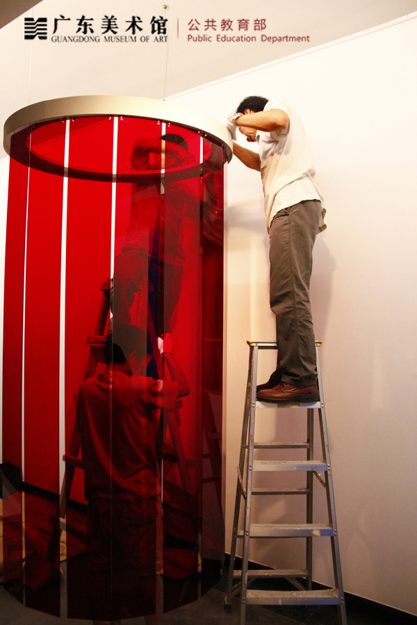 每一个展览背后都有许多故事,只有亲身经历过,才能体验到展览幕后的酸甜苦辣。“渗透的色彩”展览布展过程并非一帆风顺。布展指导专家Jose第一天开工就迟到了半天,随后又发现艺术家要求的色光滤纸无法在国内找到,接着又发现灯管的型号不符合要求(艺术家需要冷白光灯管,但找到的是暖白光灯管),电脑主机的型号也不符合要求,在壁画挂好后又发现每一张画的长度都不一样……各种问题接踵而来,着实让两位艺术家代表和志愿者们都伤透了脑筋。在开幕的前一天,为了让展览如期完工,美术馆的木工、电工、展厅管理员、志愿者、公共教育部工作人员一起加班。当日下午还是混乱一片的现场,到晚上11点的时候终于见到了雏形,只剩下灯管未能安装完毕了。在大家回家休息准备第二天的开幕式时,电工叔叔们又加班加点干了一个通宵和一个上午,才在开幕式之前完成了 “渗透的色彩”房间的最关键工序。